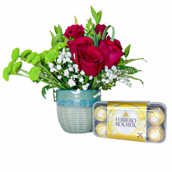 A celebration in a vase! This arrangement combines the rich red of premium roses with the textured beauty of chrysanthemums, finished with a box of Ferrero Rocher for a touch of sweetness.